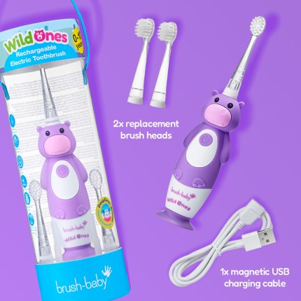 Saderīgas ar Brush-Baby WildOnes bērnu elektriskajām zobu birstēm – ar 2 minūšu taimeri un krāsainu gaismiņu, kas motivē bērnus tīrīt zobus ilgāk un patstāvīgi.