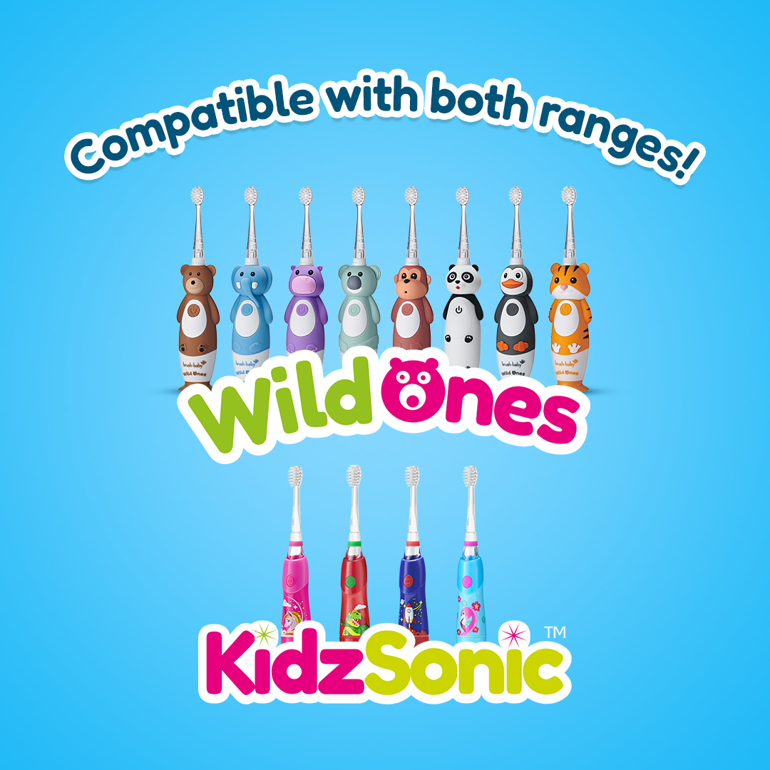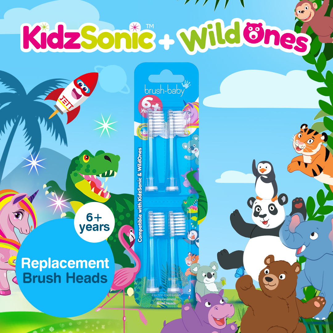 Maiņas galviņas bērnu elektriskajai zobu birstei 🪥 – maigi sariņi piena un pastāvīgajiem zobiem (6+). Saderīgas ar Brush-Baby WildOnes. Iepakojumā 4 gab., ieteicams mainīt ik pēc 3 mēnešiem.