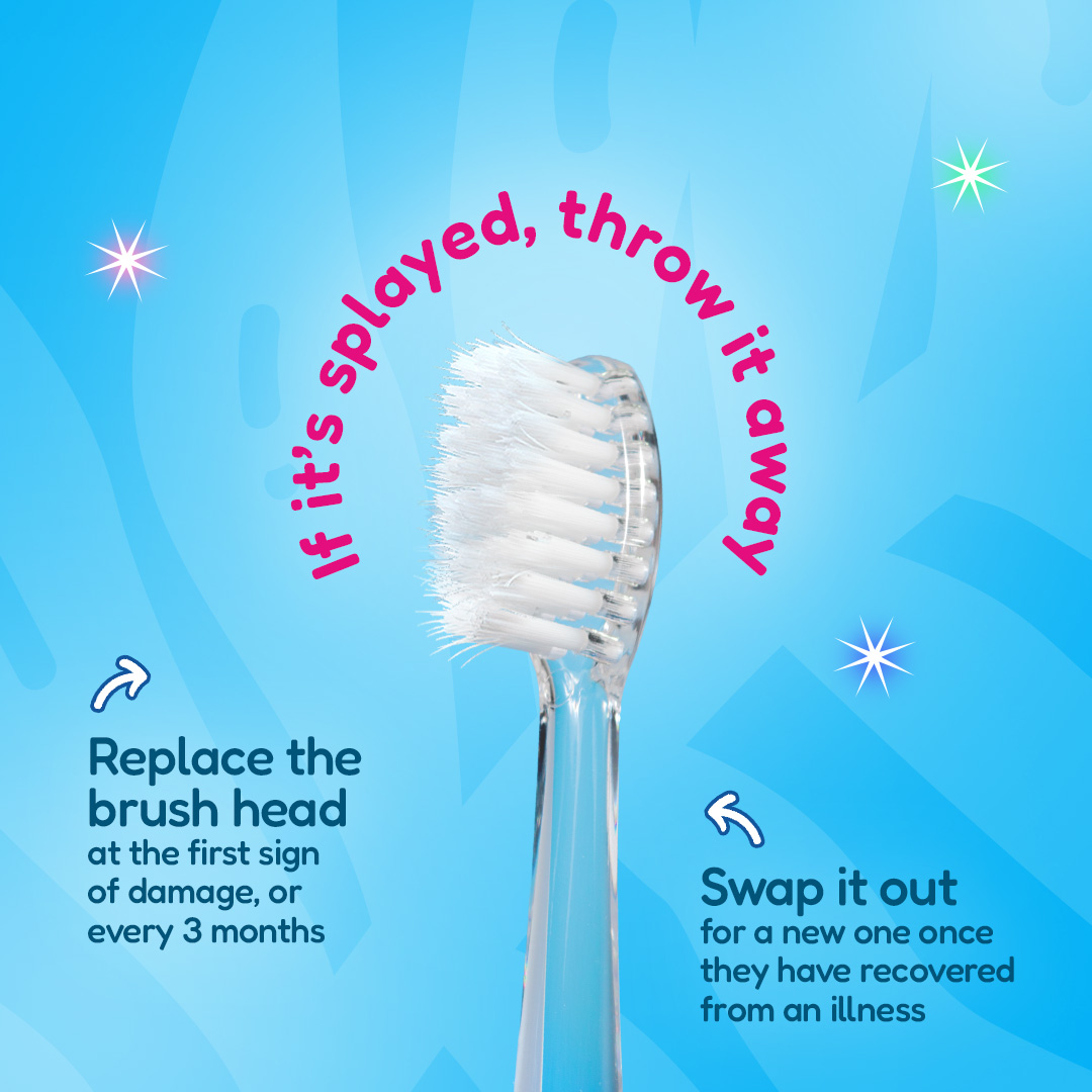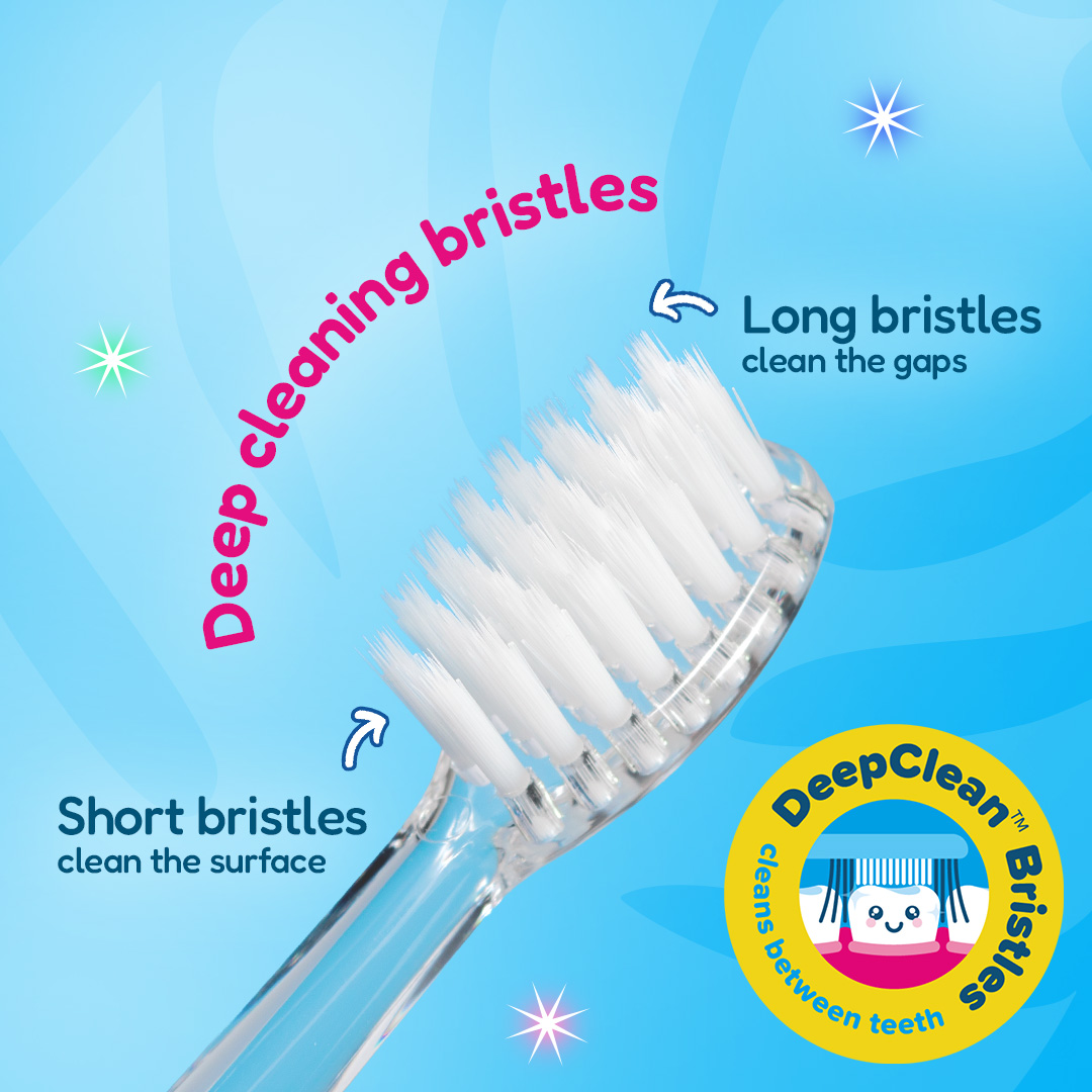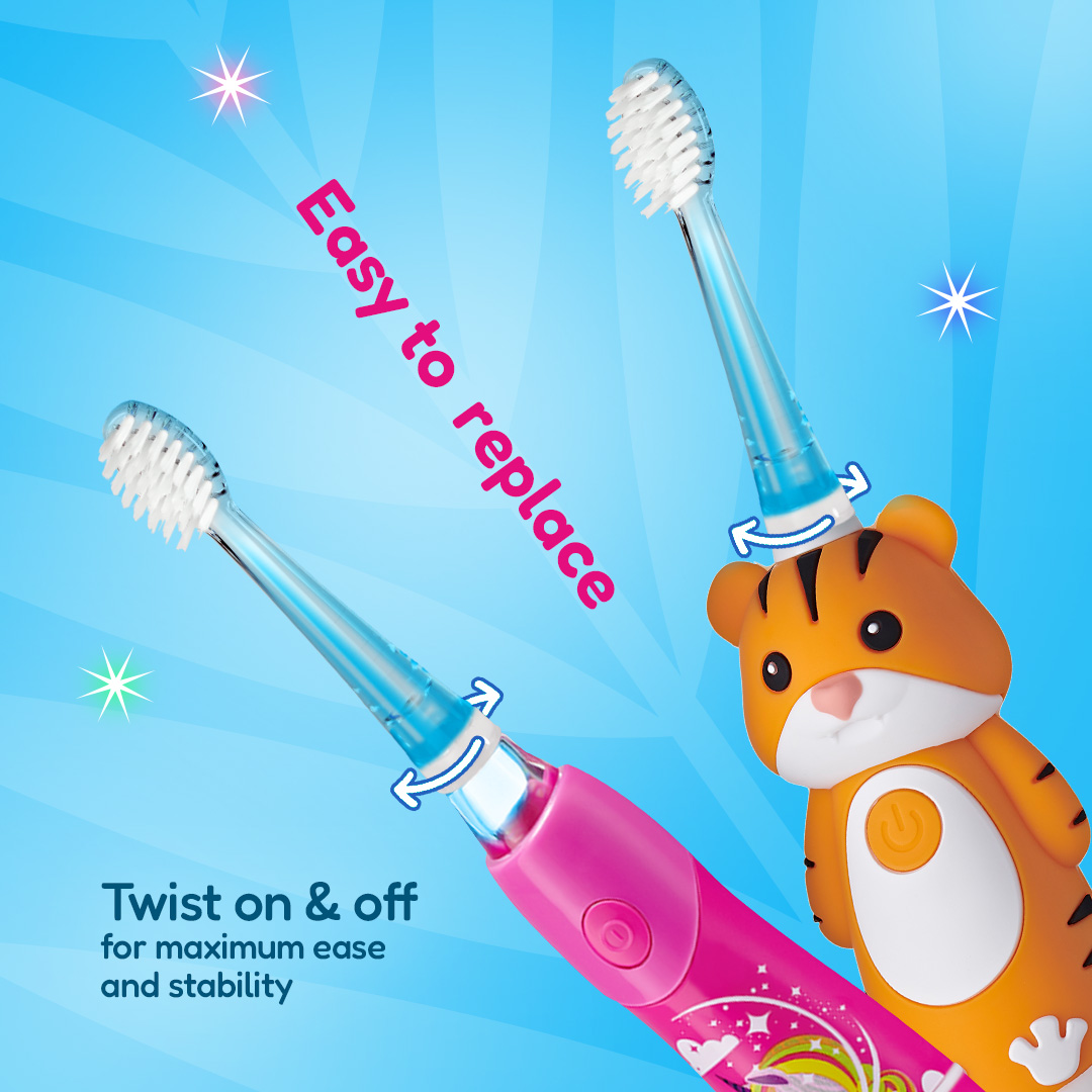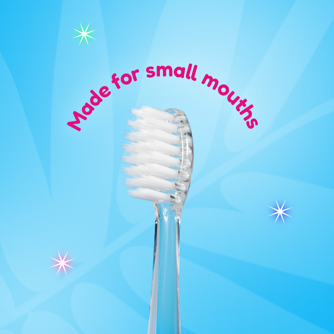 Izstrādātas bērniem – nodrošina saudzīgu, bet efektīvu tīrīšanu gan piena zobiem, gan jau izšķīlušajiem pastāvīgajiem zobiem.